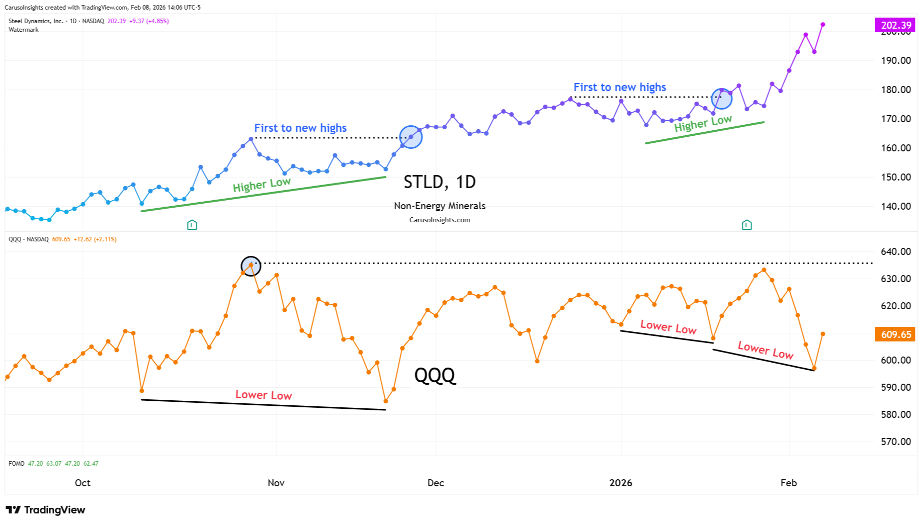 Unlike traditional cyclical steel plays, STLD benefits from structurally higher baseline demand tied to infrastructure, reshoring, and electrification. Persistent relative strength often reflects institutional preference for “hard asset” exposure as capital spending moves from digital AI into the physical economy that supports it.