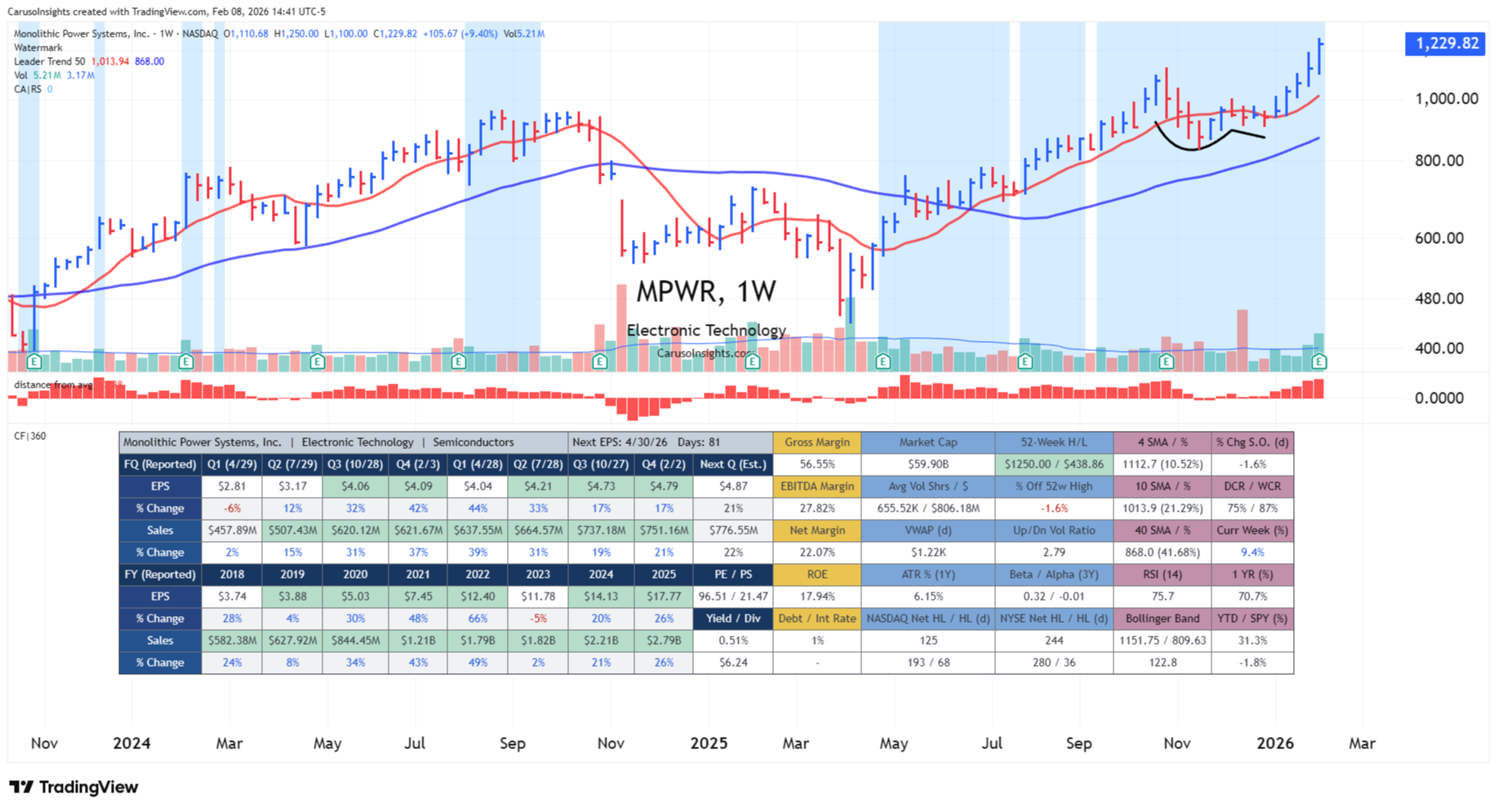 MPWR’s strength is that it’s not dependent on one end-market: the same high-performance power management playbook extends across cloud infrastructure, automotive electrification, and industrial systems. Rising RS indicates institutions want exposure to the AI supply chain without taking direct GPU cycle risk. If the next leg of AI capex is about power density, thermal constraints, and efficiency, MPWR is one of the cleanest “picks-and-shovels” ways to express that theme.