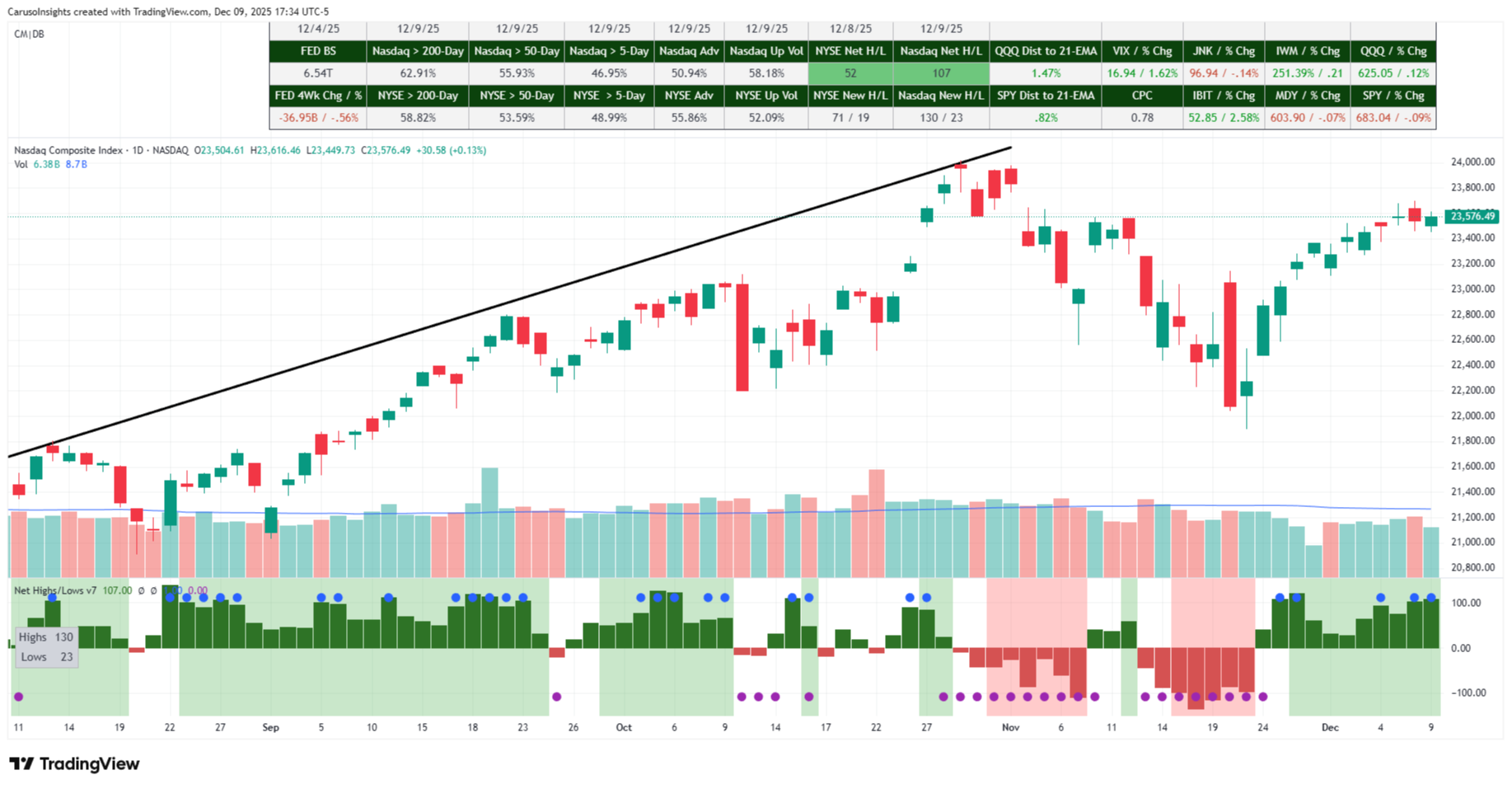 Early strength in ORCL and SFTBY (SoftBank) helped shore up sentiment, eventually leading to a buying spree in stocks that have been among the hardest hit since the October peak. This is a good example of a market gradually healing under the surface, even as the indexes don’t move much.